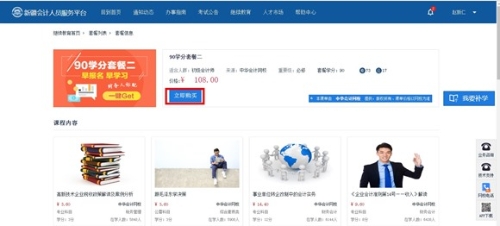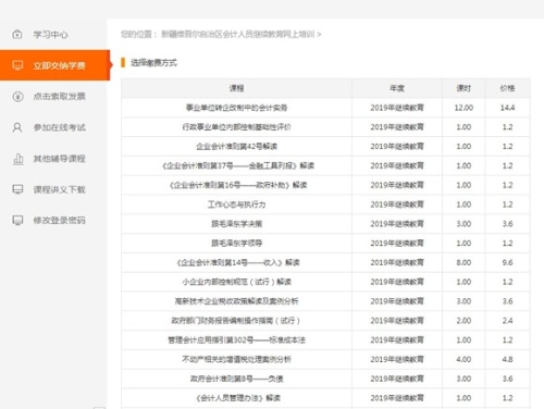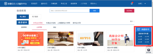 学员登录成功后,点击红框中的“继续教育”入口,进入该页面后,选择正保会计网校,可以从推荐课单中进行套餐的报名。补以往年度学分的学员,请参照(图3-3)进行以往年度的报名。确定好所选课程后点击“立即购买”,按照订单提示的金额通过网上支付进行付款学习(收费标准:1.2元/学分)。