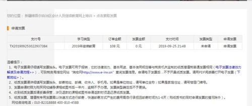 温馨提示:在课程章节页面,右上角有“申请发票”入口。交费成功的学员可从此页面进行发票的申请。