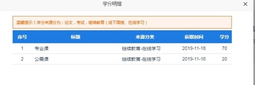 学员累计满规定学分并通过考核后,学员在个人中心下方即可看到个人的学分记录情况,点击学分,也可看到学分明细。学员的学分累计成功,本年度的继续教育即完成。