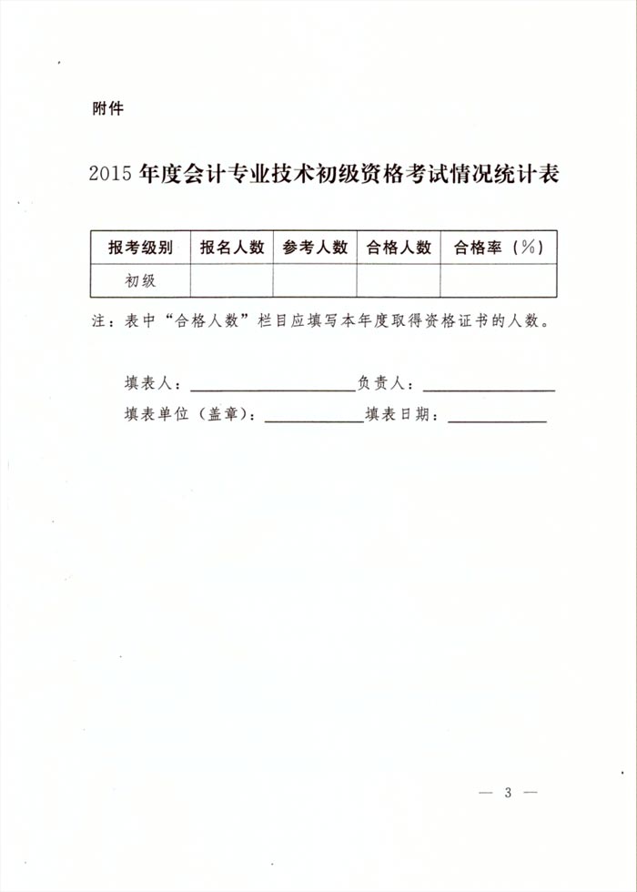 二、请各地按上述合格标准对考试人员成绩进行复核,并与财政部会计资格评价中心核对数据,确认无误后,逐项填写《2015年度会计专业技术初级资格考试情况统计表》(见附表),于6月15号前送我部专业技术人员管理司备案。备案数据将作为发放资格证书的依据。