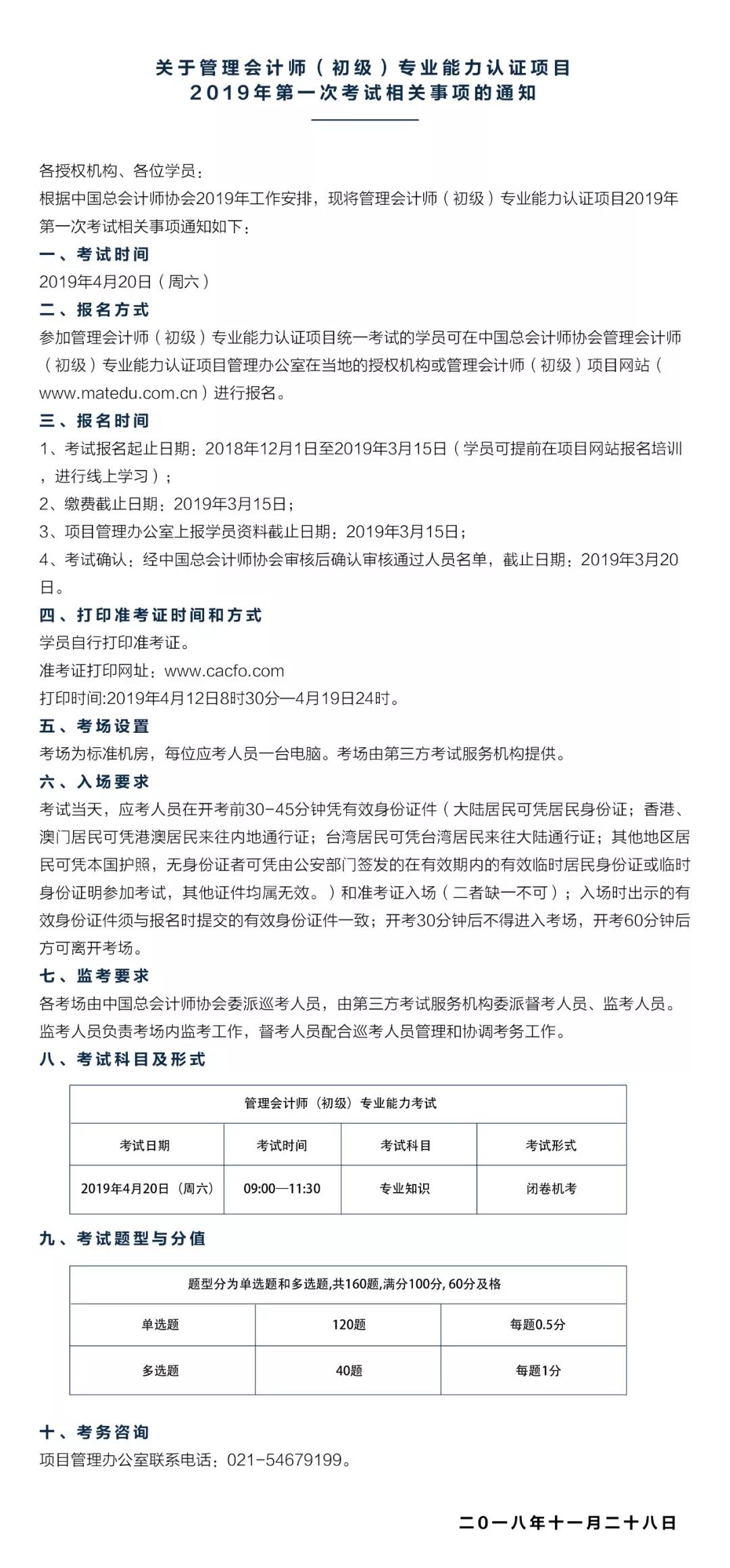 2018年11月24日管理会计师(初级)考试成绩已于12月18日公布,凡已经报名本次考试而未通过的学员,即日起可以报名参加补考,报名截止日期为2019年3月15日,考试时间为2019年4月20日,报名网站为(www.matedu.com.cn),与初次报名方式相同。
