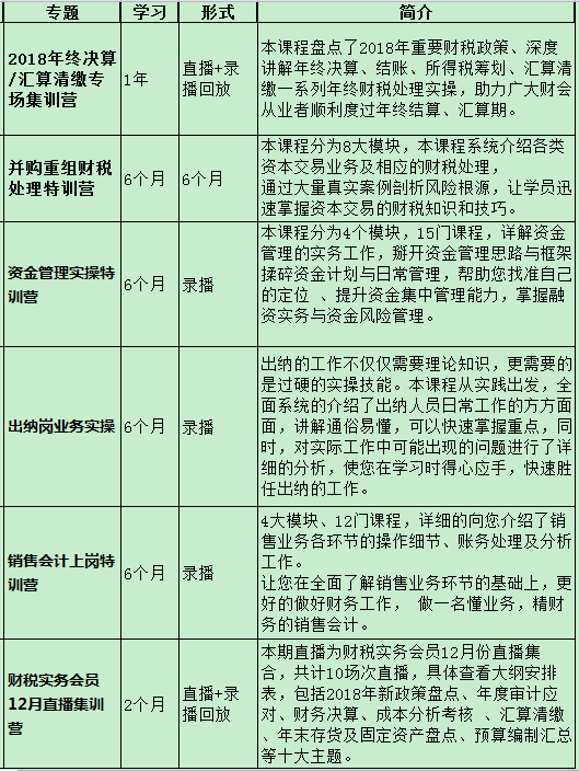 2018年即将进入尾声,一年又要到头了。为了更好地迎接2019年,网校推出了年终决算及汇算清缴专题、并购重组账税处理专题、资金管理专题、出纳岗业务实操、销售会计上岗特训营 、财税实务会员12月直播集训营六大精品专题,帮助广大财会工作者应对年终财务决战!