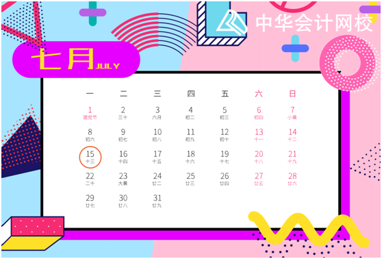 7月1日-15日 申报缴纳增值税、消费税、城市维护建设税、教育费附加、地方教育附加、文化事业建设费、个人所得税、企业所得税、核定征收印花税、水资源税、环境保护税、工会经费代收、彩票公益金代收、彩票业务费代收;