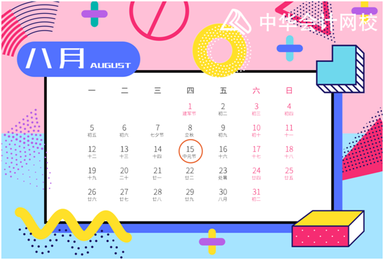 8月1日-15日 申报缴纳增值税、消费税、城市维护建设税、教育费附加、地方教育附加、文化事业建设费、个人所得税、企业所得税、核定征收印花税、彩票公益金代收、彩票业务费代收。