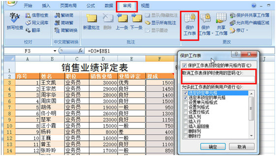 3、点击“审阅”功能选项卡,点击“保护工作表”按钮,在“保护工作表”对话框中输入密码,确定,然后再确认输入一次密码,确定返回。