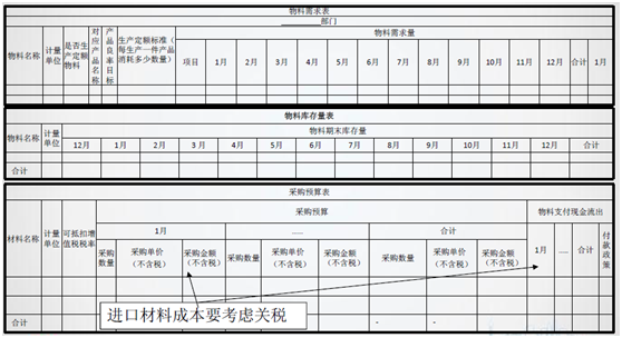 注意:进口材料来料加工直接出口的,进口材料可以免税。国内材料采购不用考虑关税因素。付款预算时候考虑含增值税预算。