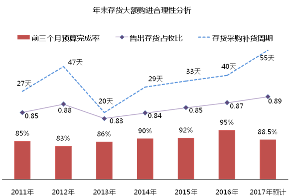 根据采购部门的解释,2017年的供货周期预计达到55天,为保证销售(营销部预计1-2月销售收入2133万元),在年末集中采购了3000万元的存货。