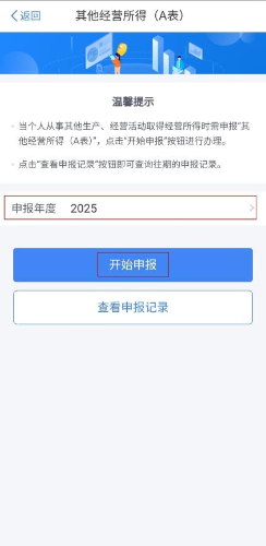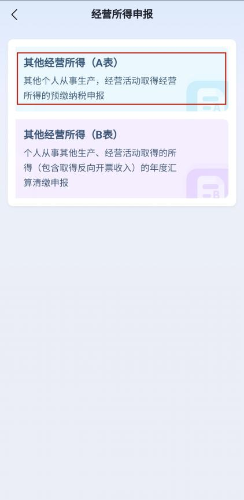 第一步:打开个人所得税App,登录后点击【办&查】-【经营所得申报】,并选择【其他经营所得(A表)】,进入申报页面。