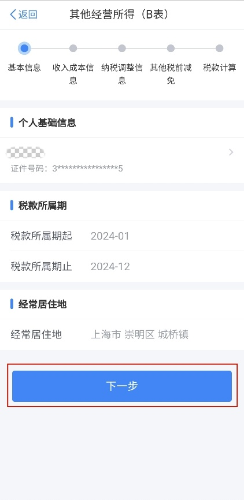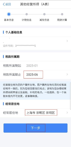 第三步:选择税款所属期和经常居住地(个人基础信息不可修改),选择完毕后,点击【下一步】。