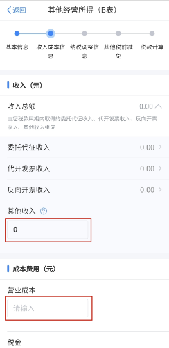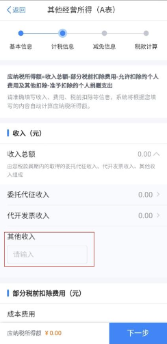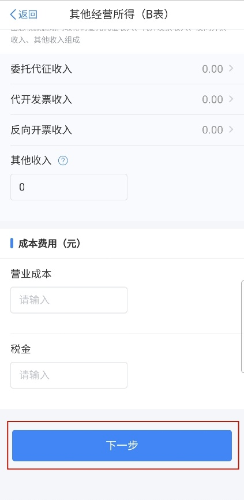 第四步:填写收入总额和成本费用。其中委托代征收入、代开发票收入由系统自动填写且不可修改。据实填写税款属期内实际发生的成本费用。以上信息填写完毕后,点击【下一步】。