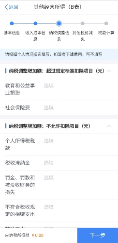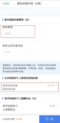 第四步:填写收入总额和成本费用。其中委托代征收入、代开发票收入由系统自动填写且不可修改。据实填写税款属期内实际发生的成本费用,可选填弥补以前年度亏损。根据实际情况选择是否在综合所得中扣除,并选填准予扣除的个人捐赠支出。以上信息填写完毕后,点击【下一步】。