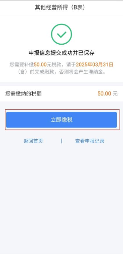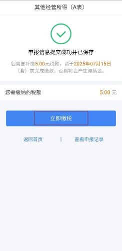 第六步:核对信息确认无误后,点击【提交申报】。若有需要缴纳的税款,点击【立即缴税】可进行在线缴款操作。