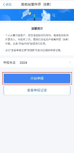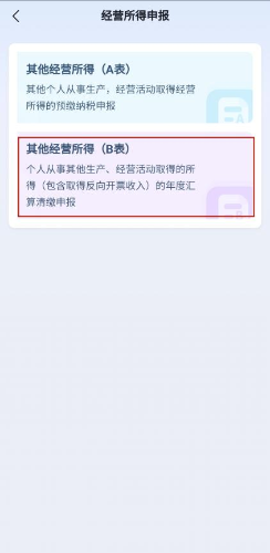 第一步:登录个税App后点击【办&查】-【经营所得申报】,并选择【其他经营所得(B表)】,进入申报页面。