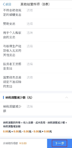 第五步:据实填写纳税调整增加额和纳税调整减少额(选填),填写完毕后,点击【下一步】。