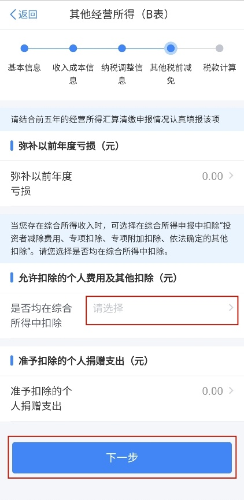 第六步:选填弥补以前年度亏损。根据实际情况选择是否选择在综合所得中扣除,并选填准予扣除的个人捐赠支出,然后点击【下一步】。