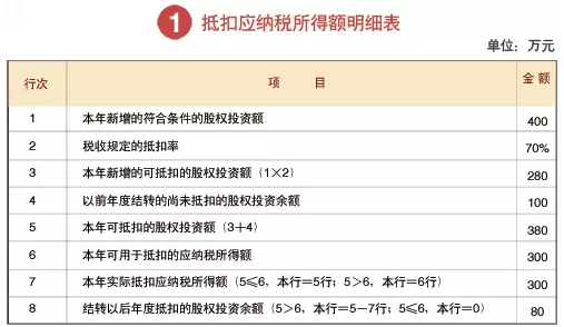 上例中,如果其他条件不变,纳税调整后所得为500万元,弥补亏损后金额为400万元,由于弥补亏损后应纳税所得额大于可抵扣股权投资额,实际抵扣应纳税所得额=可用于抵扣的股权投资额=380万元,应纳税所得额=400-380=20(万元),结转以后年度抵扣的股权投资无余额。应填报“抵扣应纳税所得额明细表”,见表3.
