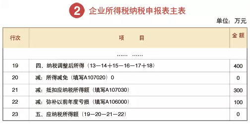 同时,“抵扣应纳税所得额明细表”第7行“本年实际抵扣应纳税所得额”的数据会带入主表第21行,主表计算应纳税所得额,见表2.