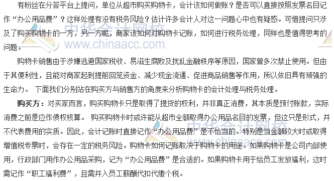 销售购物卡不等于销售商品。为避免税务风险,购买方不能简单地凭发票名目确认费用,而是要根据购物卡的实际用途进行账务处理。对销售方而言,销售购物卡不符合收入确认的要求,收到的款项本质是预收账款。在纳税时点上,现行做法是购物卡出售时需同步缴纳增值税。