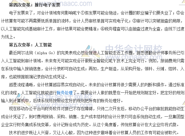 近20年来,会计有五次重大变革。第一次变革,实行会计电算化,这次变革让会计工作变得轻松,会计人员被极大精简;第二次变革,统一分行业的会计制度,会计语言得到了统一;第三次变革,营改增,企业税务处理更加简单,税收逻辑更加清晰。第四次变革,推行电子发票。第五次变革可能引入人工智能。