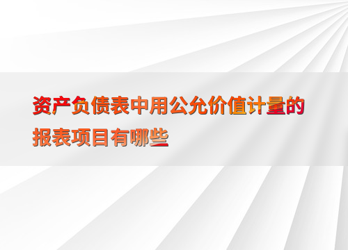 在财务报表中,公允价值是指市场参与者在计量日发生的有序交易中出售一项资产所能收到或者转移一项负债所需支付的价格。资产负债表中使用公允价值计量的项目主要包括金融工具、投资性房地产和某些衍生工具等。