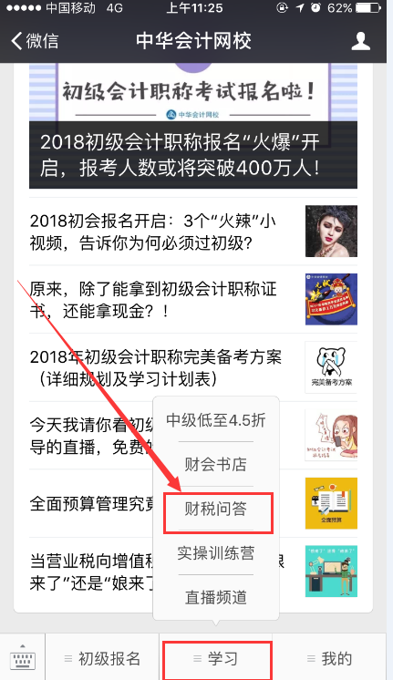 关注后,你的页面应该是下图这样的,然后选择“学习”中的“财税问答”,即可与网校财税大咖沟通啦。