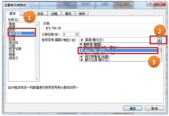 如果设置数据分类为“会计专用”,货币符号(国家/地区)设置为“€ Eero”即可在数据前面显示欧元符号。