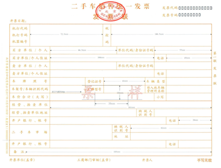 《二手车发票》为一式五联计算机票。计算机票第一联为发票联,印色为棕色;第二联为转移登记联(公安车辆管理部门留存),印色为蓝色;第三联为出入库联,印色为紫色;第四联为记账联,印色为红色;第五联为存根联,印色为黑色。