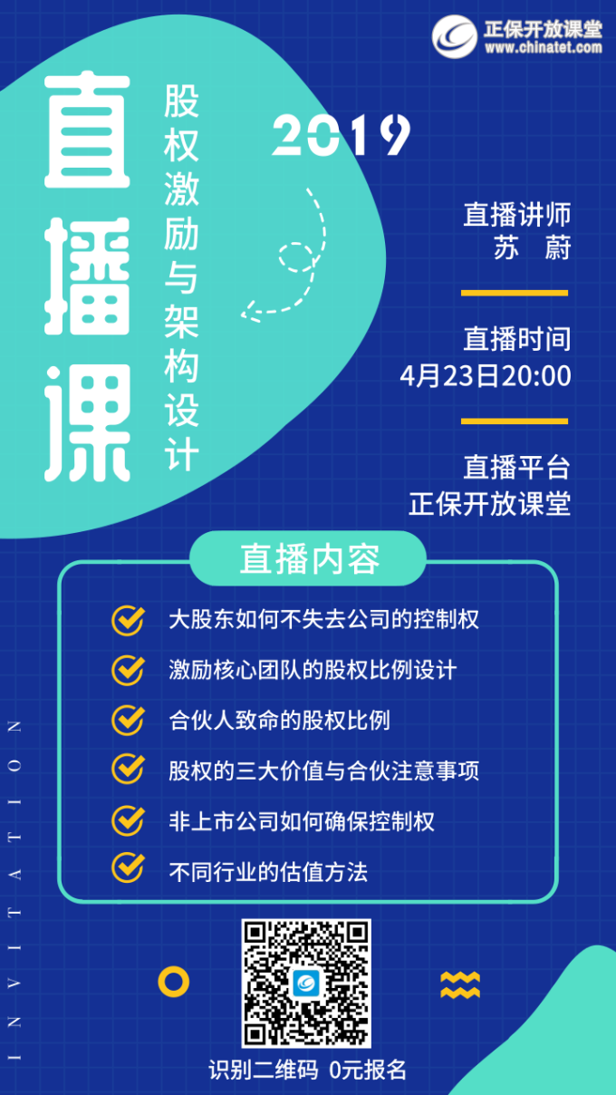课程收益:通过本次公开课,财务负责人可以学习股权架构的设计方法,规避股权激励过程的陷阱。设计动态股权的调整机制,掌握股权机制的运作方式。帮助创业者在企业初创期合理分配合伙人的股权,掌握寻找合伙人的要点,通过科学的股权激励机制构建企业的核心竞争力。以科学合理的股权布局为企业发展构建良好基础,规避实际控制人失去控制权的风险。