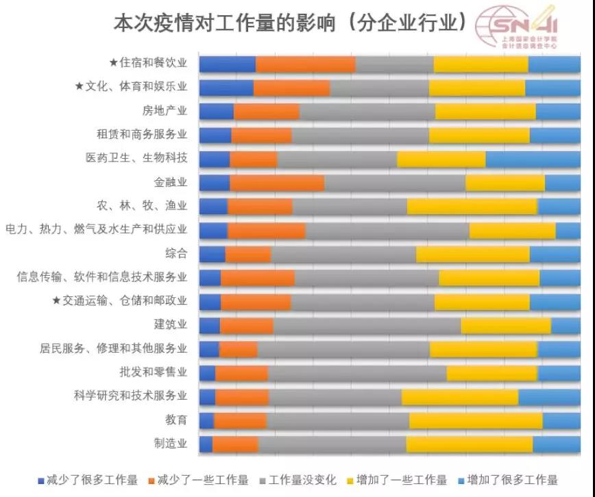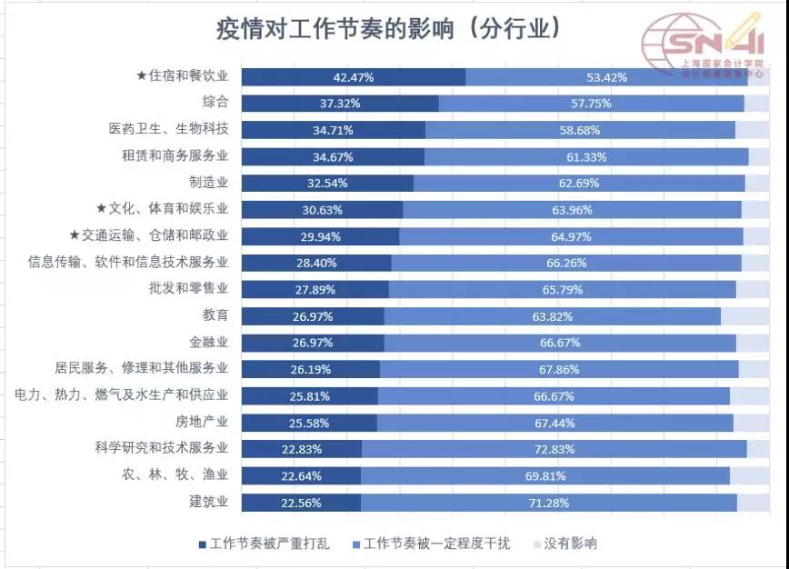 住宿和餐饮业(15.1%)和文化、体育和娱乐业(14.4%)企业财会人员工作量减少很多,这是被疫情冲击最直接的两个行业。