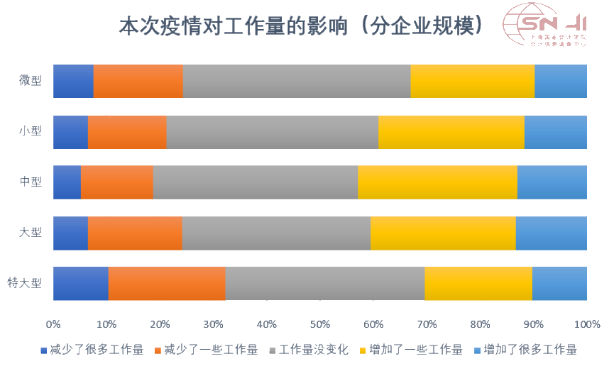 疫情对企业财会人员工作量的影响,特大型企业的财会人员工作量总体是减少的——30.5%的人增加了工作量,32.2%减少了工作量,前者比后者还少1.7个百分点。