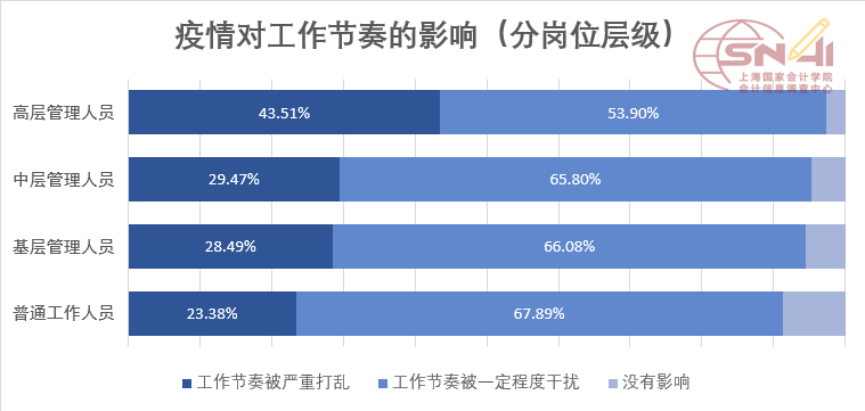 工作节奏被疫情严重打乱的程度,和岗位层级正相关。即职业层级越高,被严重打乱的比例越高。