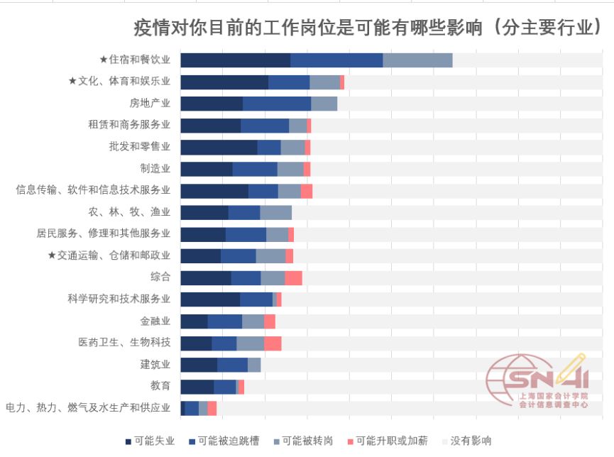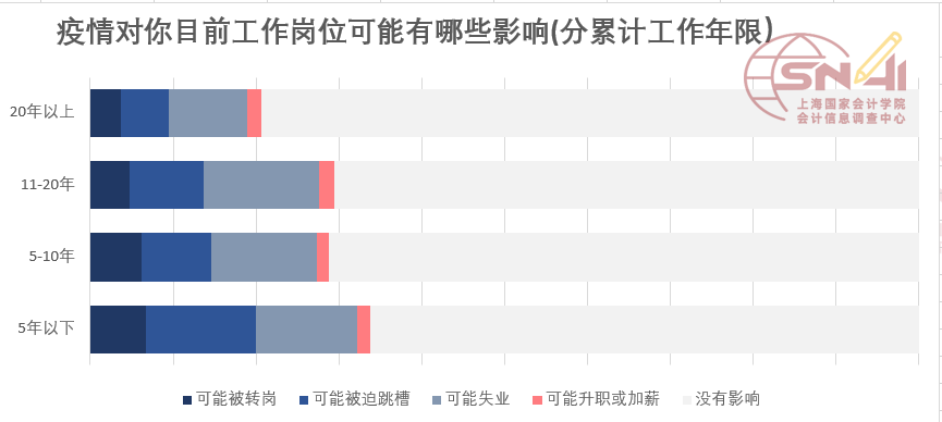 疫情对住宿和餐饮业财会人员的岗位影响最大,近一半(46.6%)的该行业财会人员认为自己的工作岗位可能受到负面影响,有26%的人认为自己可能会失业;其次是文化、体育和娱乐业,影响程度超过了36%。如果短期内部分行业的财会人员工作岗位被影响,被失业:如何度过难关?如何再上岗?是值得关注的问题。