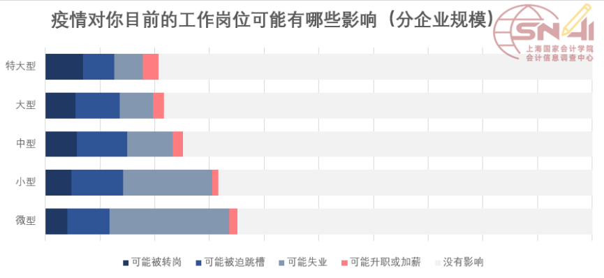 疫情对企业财会人员工作岗位的负面影响与企业规模大小负相关,企业规模越小,影响越大。微型企业的财会人员超过30%的工作岗位可能受到负面影响,有22%预测自己会失业。从调查数据看:在短期内,有必要特别关注小微企业财会人员的就业问题。