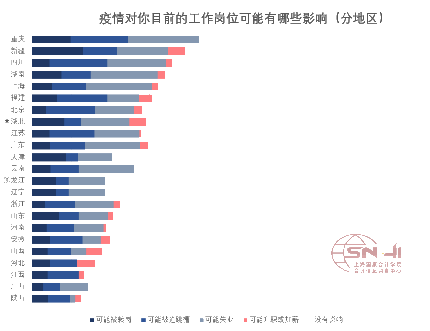 疫情影响企业财会人员工作岗位,影响程度靠前的地区是重庆、新疆、四川这样的非重点疫区。疫情的影响可远不止是重点疫区,由此可见一斑。