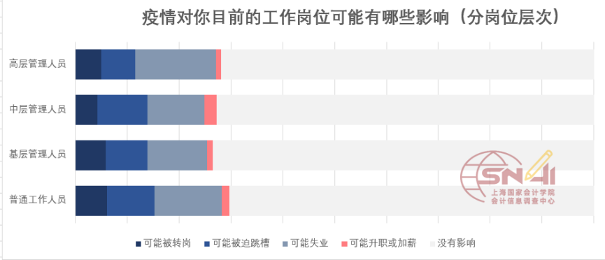 疫情对高层管理者的冲击最大,对其他职位层次的影响程度则是相近的。企业财务高管有15.6%认为自己可能失业,位居高位者面对的风险也较高,包括突发事件下的高风险。