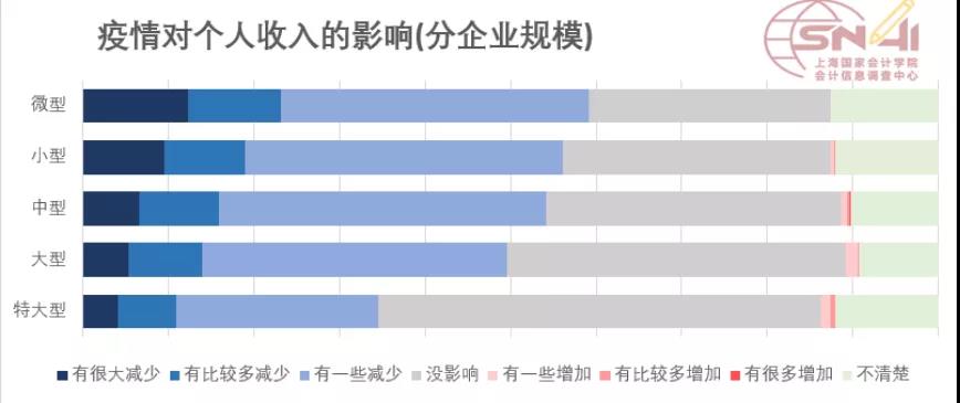 财会人员个人收入预期减少最多的是微型企业。所在企业规模越大,企业财会人员收入预期减少的就越少。