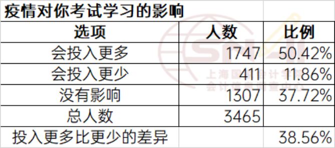 企业财会人员的考试学习意愿与考试学习的条件、环境,个人的职业规划等因素密切相关。本次疫情显著影响了企业财会人员对于考试学习的意愿,50.42%的人表示自己会投入更多,11.86%会投入更少,前者比后者要多38.56个百分点。