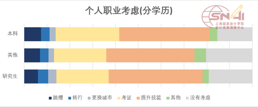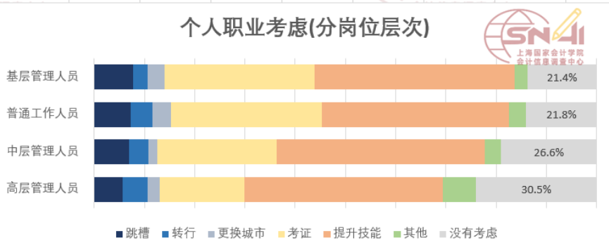 受疫情影响,住宿和餐饮业的财会人员对职业发展的考虑是最多的(人均有1.84个考虑),而且考虑跳槽的体例也是最高的,有24.7%;考虑转行的也是最多的,有12.3%。一个行业的财会人员大规模的考虑跳槽和转行,这需要个人、企业、政府多方面的协同努力。