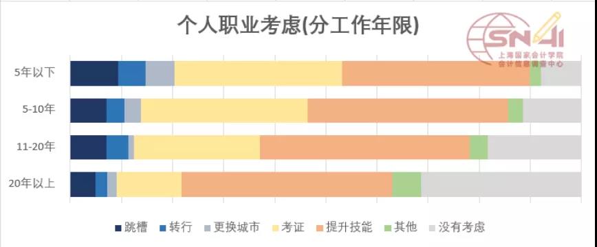 投融资和核算类人员跳槽的意愿最为强烈。核算岗位人员有强烈的职场提升的意愿,考证和提升技能的意愿都最强。这个结果和2019年11月上海国家会计学院发布的《企业会计的未来》调查报告观点是相互呼应的。在该报告中有这样的观点:未来5-10年,普通的“会计核算”职能的重要性要大幅度降低;在企业会计人能力建设中,“会计核算”的需求也比较小。