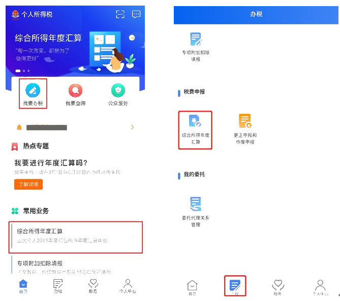 使用手机APP 端申报,您可以从以下入口进入年度汇算:一是从首页的【常用业务】区块的【综合所得年度汇算】进入;二是从【快捷入口】-【我要办税】下或底部【办税】菜单进入后,点击在【税费申报】下的【综合所得年度汇算】。