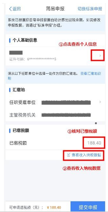 (一)核对个人基础信息、汇缴地、查看收入明细数据, 确认已缴税额。