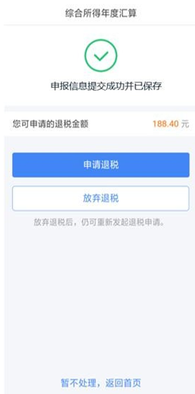 如果您的银行卡不在身边,或者暂时不想退税,可以点 击【暂不处理,返回首页】。后续可再次发起退税申请。