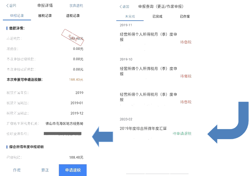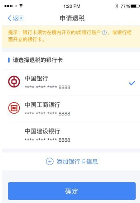 选择银行卡后提交退税申请,可以看到退税申请进度。