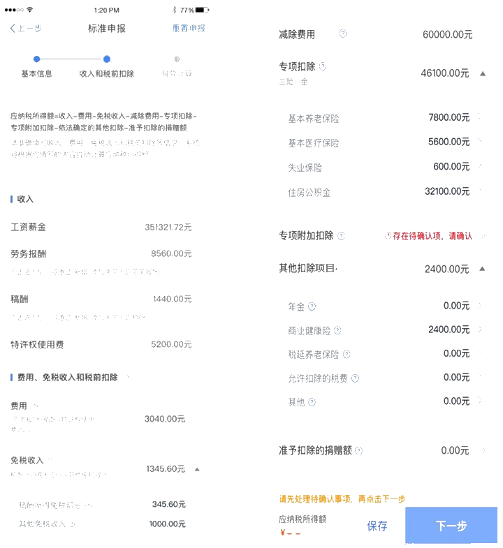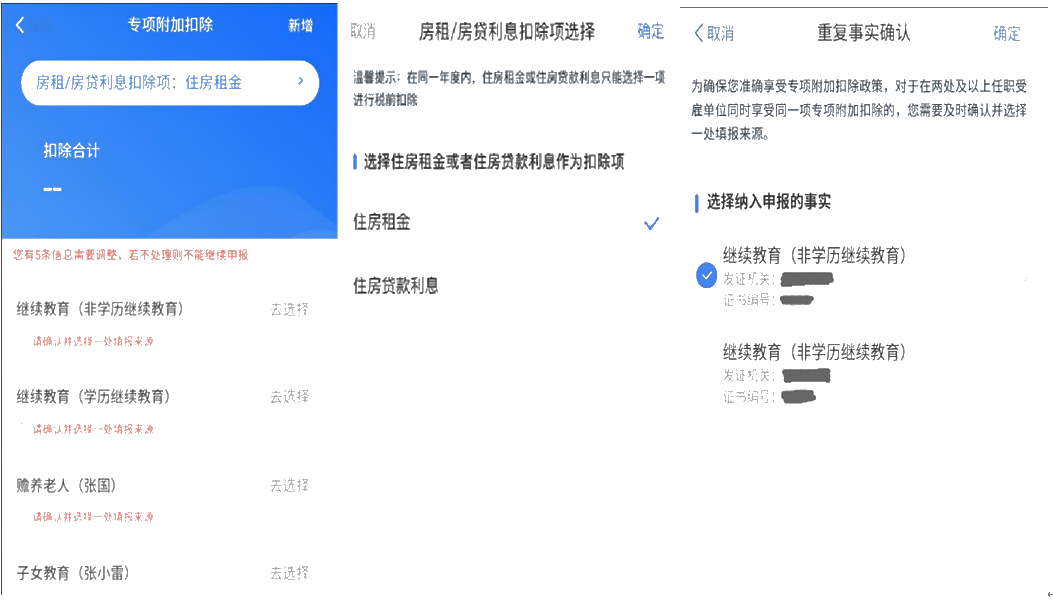 若同一专项附加扣除有重复事实或同时存在住房租金 和住房贷款利息,则系统界面上将出现提示。此时,您需要对相关信息进行确认。