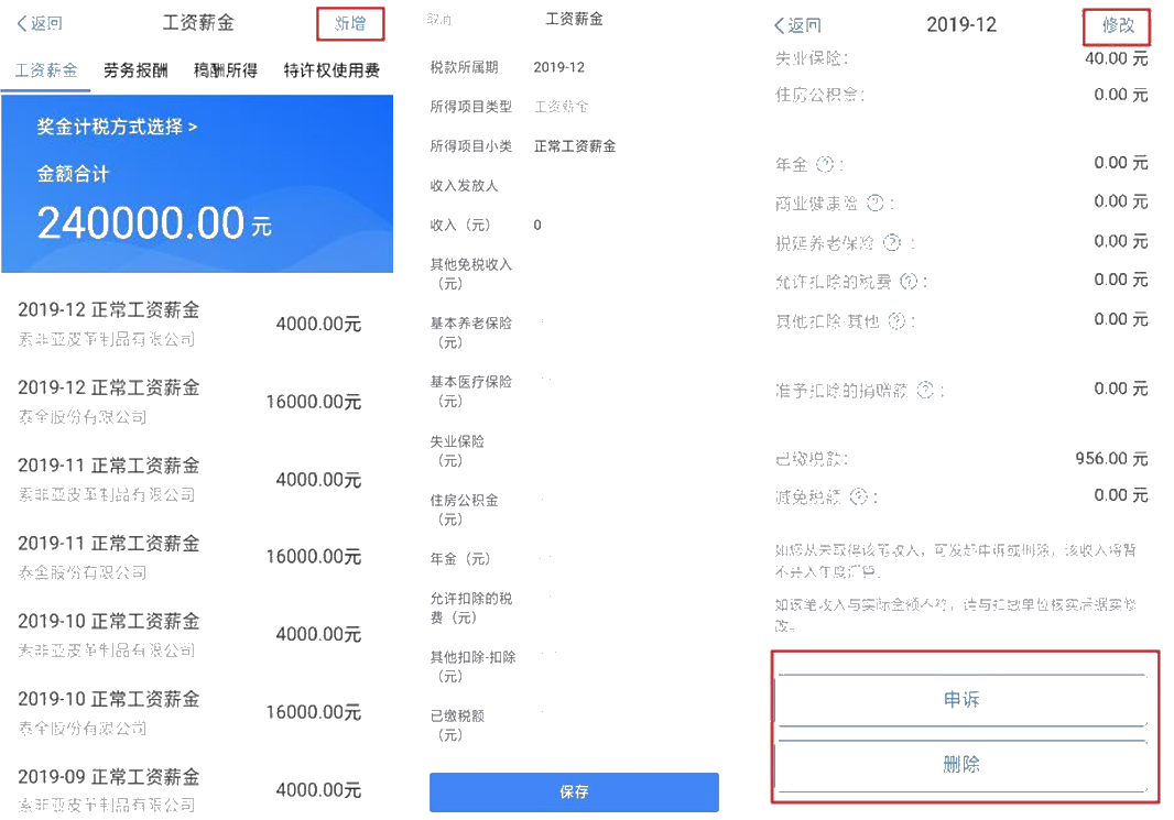 点击除专项附加扣除之外的明细数据可进入对应详情 界面,您可进行【新增】、【修改】、【删除】、【申诉】等操作,步骤同前一步的(一)完善收入数据一致。
