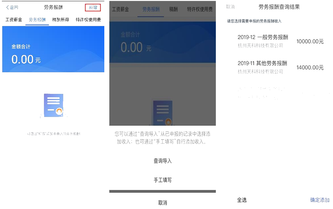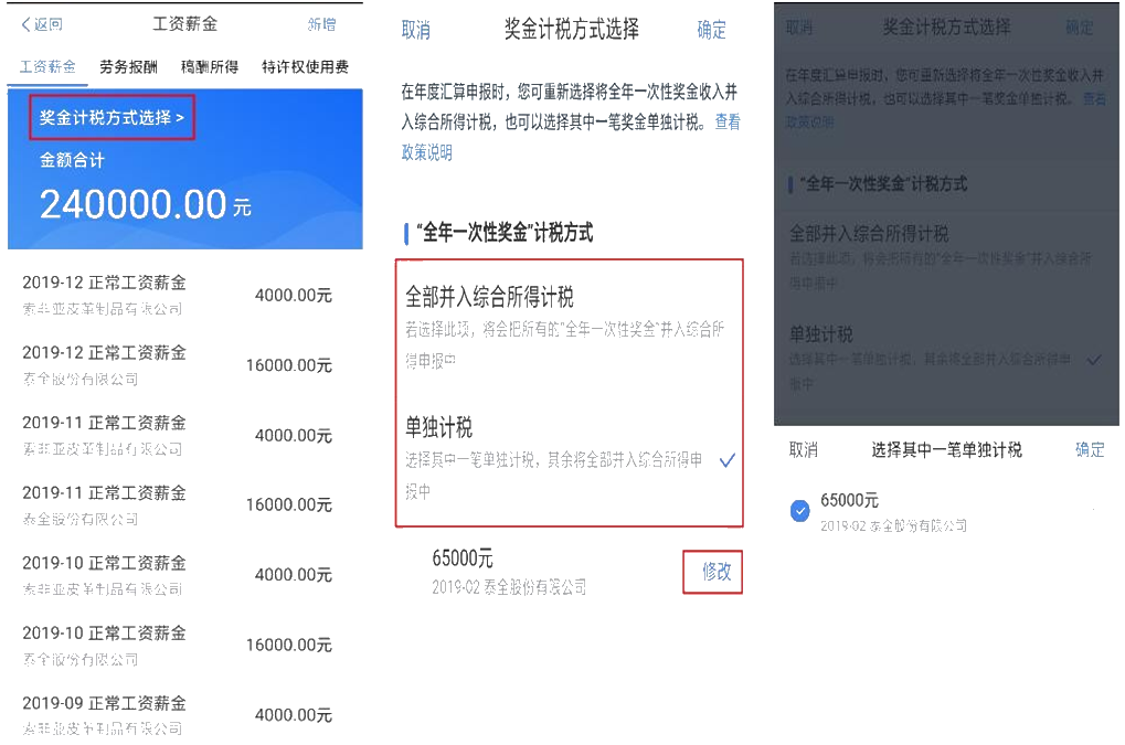 2.年度汇算时,如您选择将全年一次性奖金合并至综合所得计税的,或者有多笔全年一次性奖金的,可通过 【奖金计税方式选择】进行设置。2.新增劳务报酬或稿酬可在对应列表明细界面,点击【新增】,选择【查询导 入】,在查询结果界面勾选相应收入后可带入。