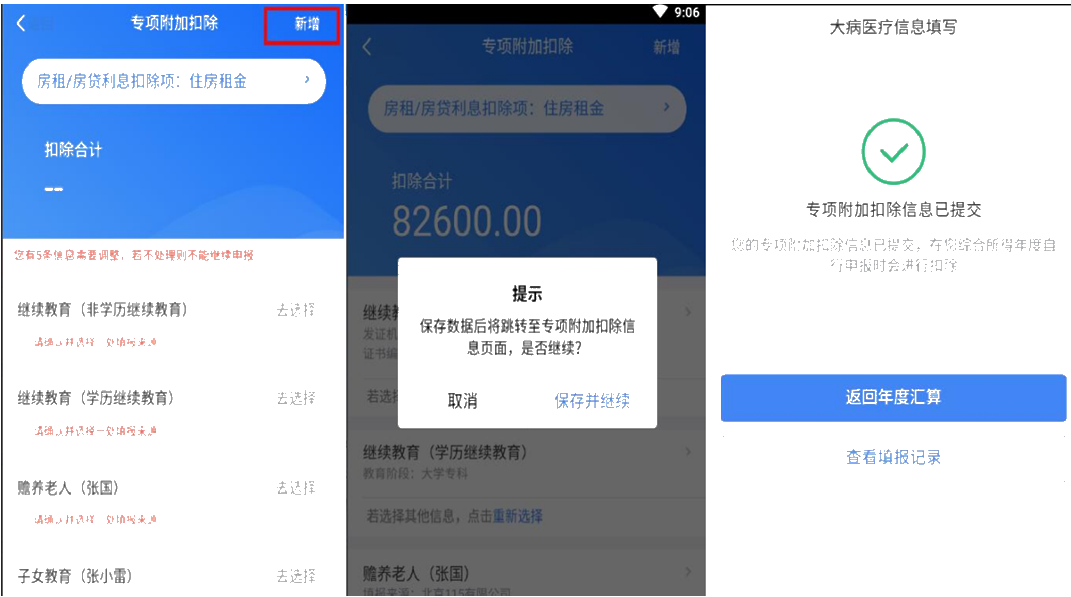 若您需要新增或修改专项附加扣除信息,可点击【新增】, 跳转至采集界面。采集完成后,可选择跳转回年度汇算继续 填报。
