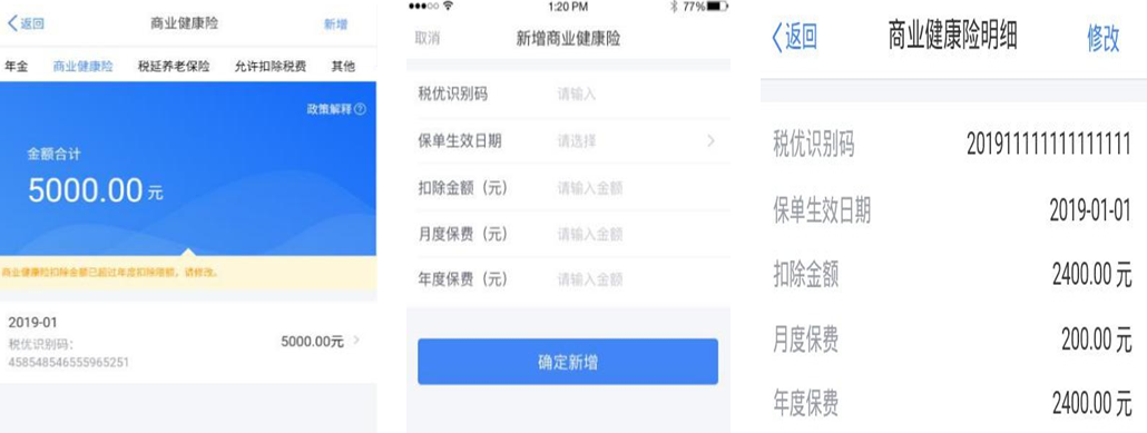 在其他扣除明细列表界面,您可点击【商业健康险】、【税收递延养老保险】页面,分别进行新增和修改。