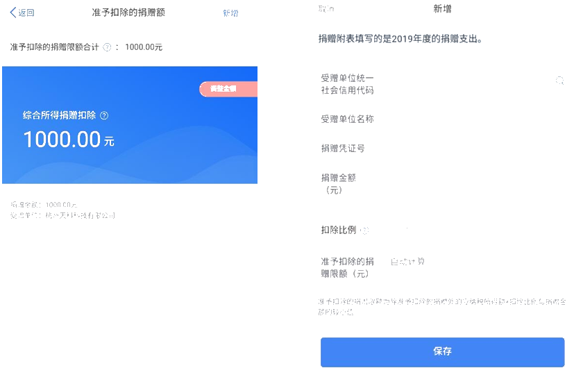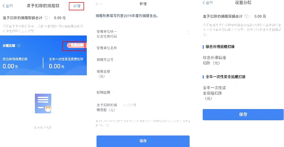 【准予扣除的捐赠额】(或在收入和税前扣除信息界面的【准 予扣除的捐赠额】)进入捐赠详情界面进行【新增】和【设置扣除】。