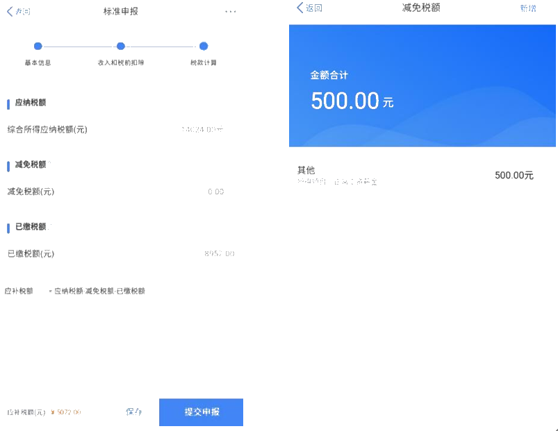 如您有减免税事项,可以点击【减免税额】新增相关信 息。确认结果后,点击【提交申报】。